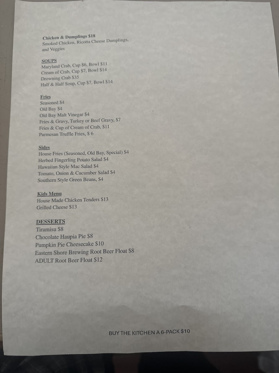 Whether stopping by for a midday meal or settling in for an easy evening bite, guests can enjoy a variety of dishes that reflect the local coastal character. House-made soups like Maryland Crab and Cream of Crab provide a warm start, while smoked ribs and pit beef showcase the kitchen’s dedication to thoughtful preparation and quality ingredients. Complementing these main dishes, sides like hand-cut house fries and herbed fingerling potato salad offer balanced, simple flavors that enhance the overall meal.